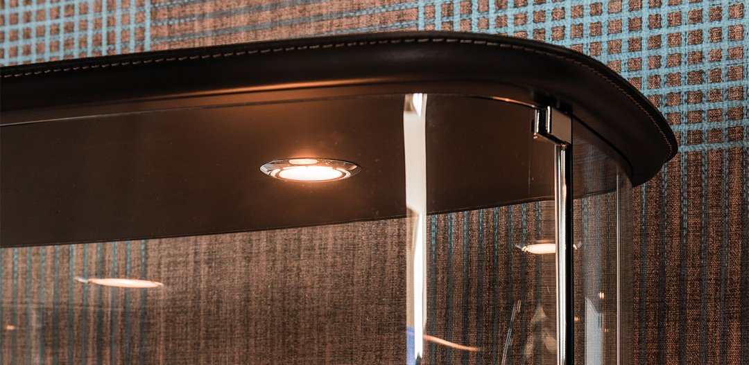 Витрина из прозрачного стекла с верхней частью и дном, обитыми в твердую кожу цветов согласно образцам. С светодиодные светильники. Грузоподъемность полок: 10 кг каждая.