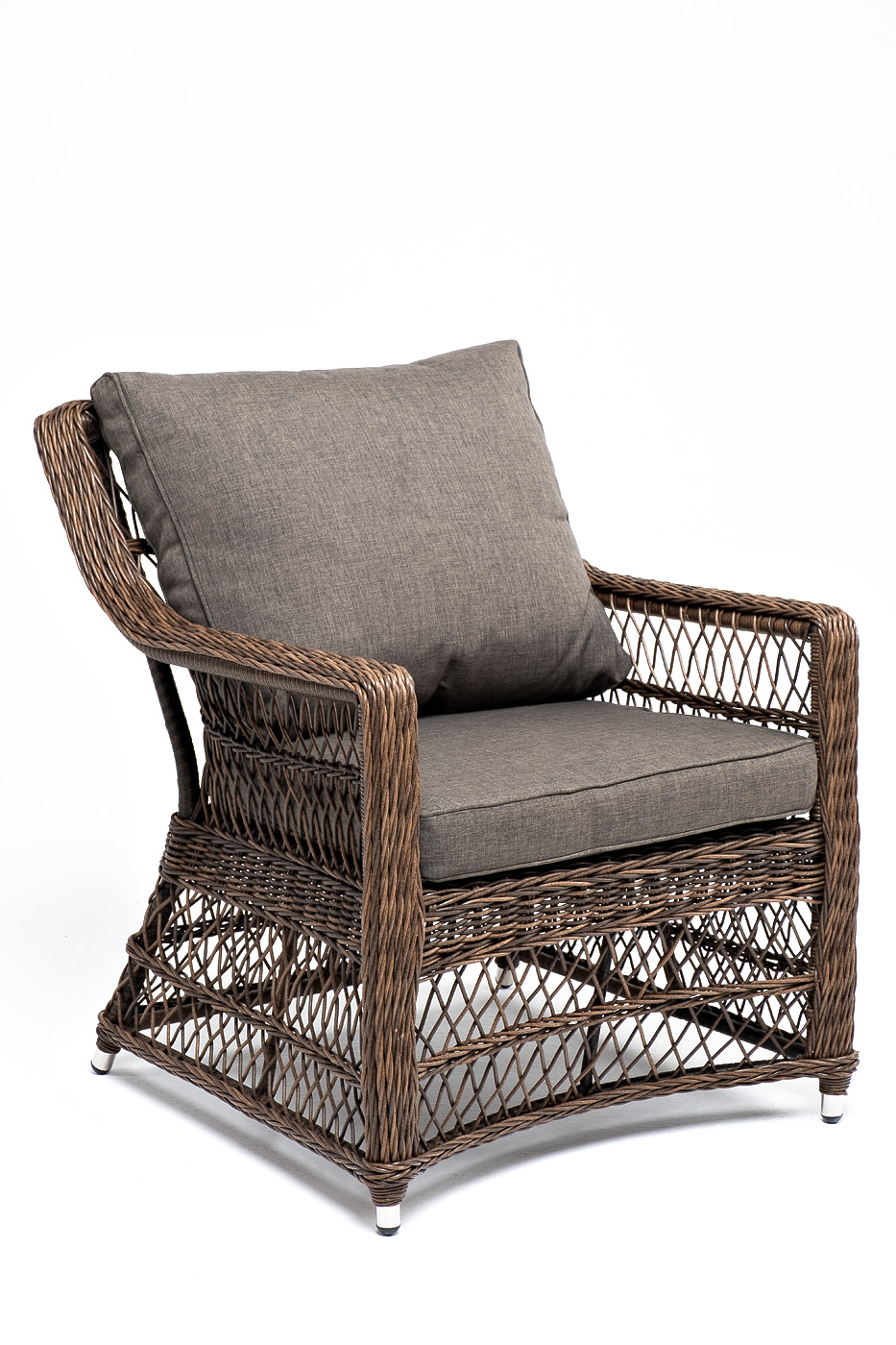 Укомплектовано плетеное кресло удобными мягкими подушками, одна из которых располагается в области спинки. Они выполнены в серо-коричневом оттенке. При пошиве тканевых изделий используется полиэстер, плотностью 230гр/м2. Он в обязательном порядке проходит обработку влагоотталкивающей пропиткой.