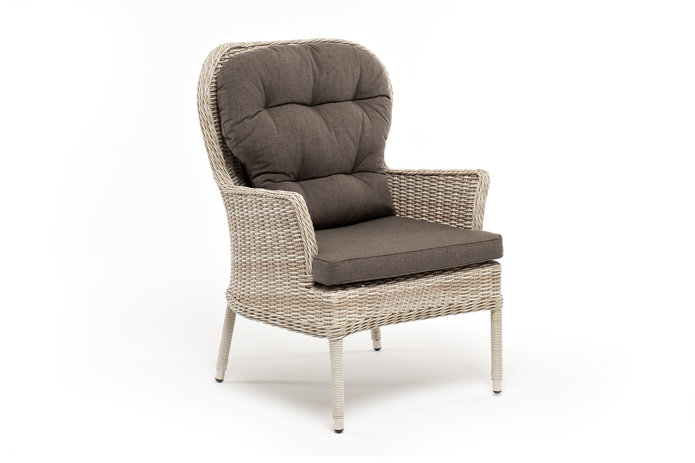 В садовое кресло укомплектовывается мягкими подушками. Они пошиты из износостойкого полиэстера серо-коричневого оттенка с плотностью 230гр/м2. Защитные свойства синтетического материала усиливаются благодаря влагоотталкивающей пропитке.
