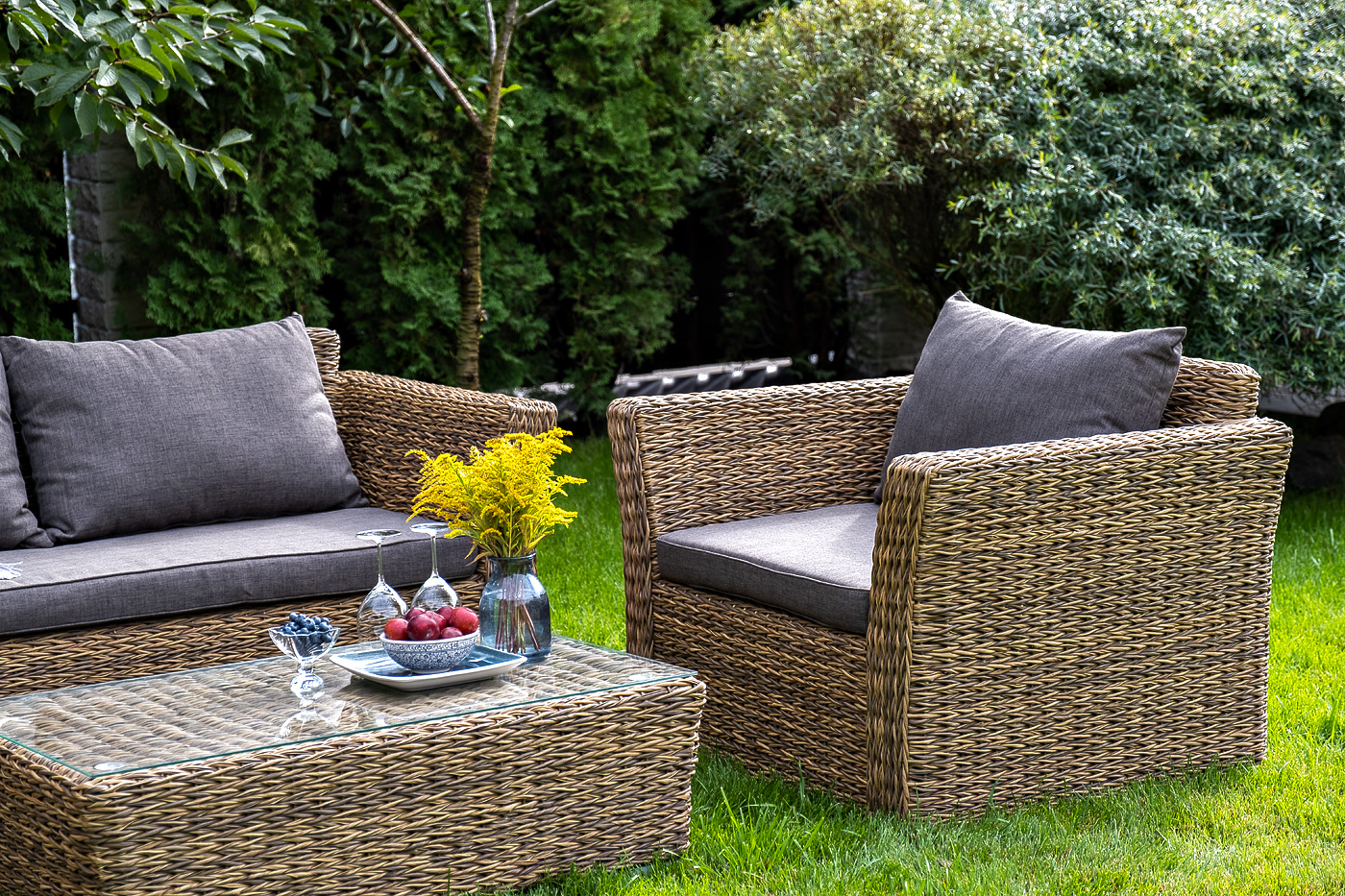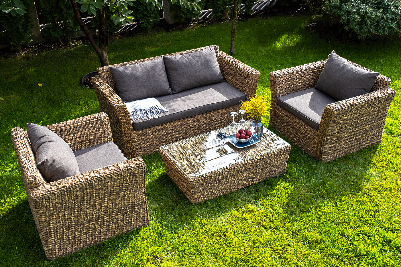 Каркас изготовлен из прочного алюминия, оплетенного вручную искусственным ротангом вида «гиацинт» соломенного оттенка.