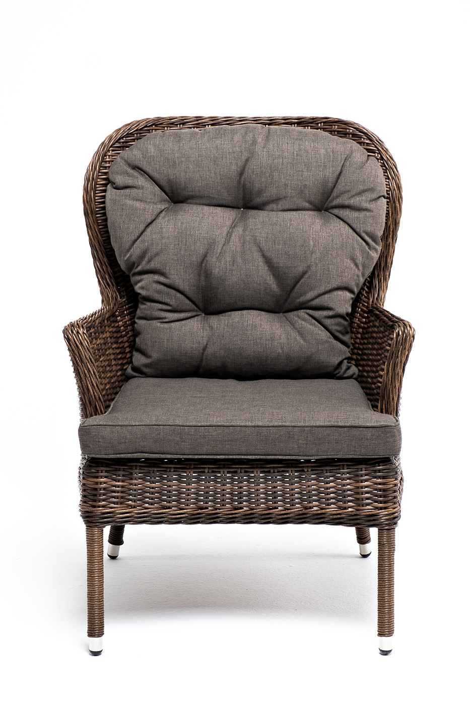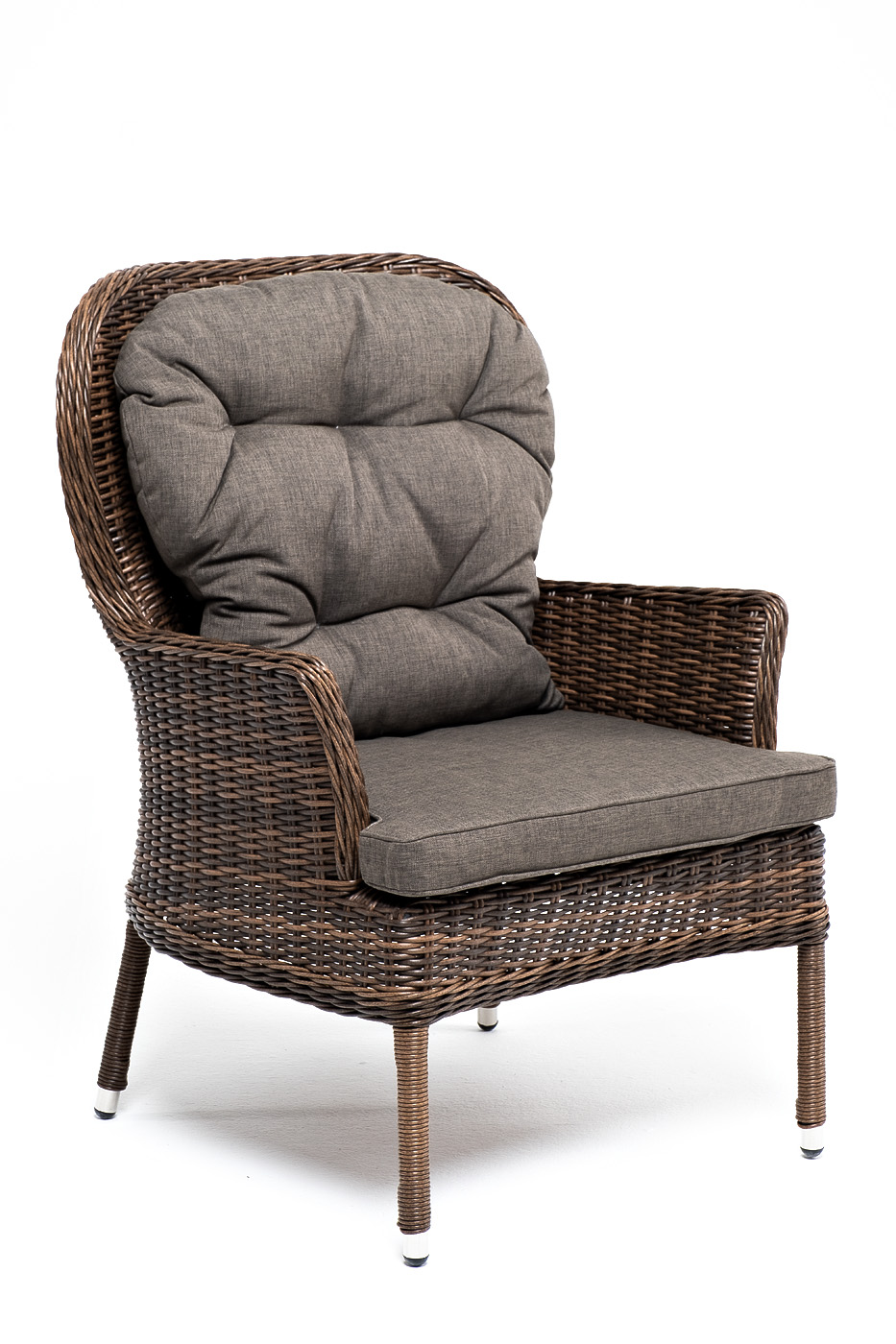 В садовое кресло укомплектовывается мягкими подушками. Они пошиты из износостойкого полиэстера серо-коричневого оттенка с плотностью 230гр/м2. Защитные свойства синтетического материала усиливаются благодаря влагоотталкивающей пропитке.