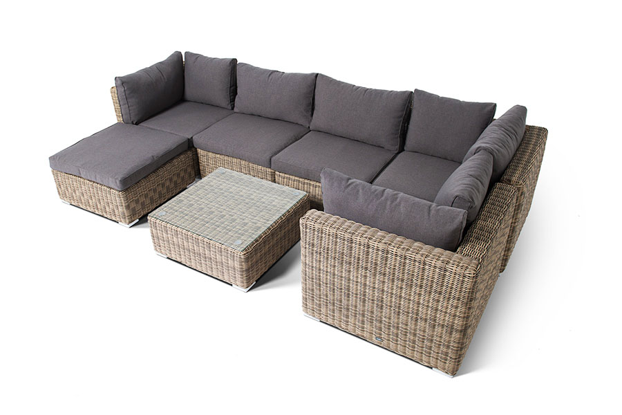 Прямой модуль «Лунго», выполненный из круглого искусственного ротанга натурального соломенного оттенка, позволяет использовать не только как самостоятельный элемент, но и быть частью лаунж-зоны, в которую данная модель превосходно интегрируется.