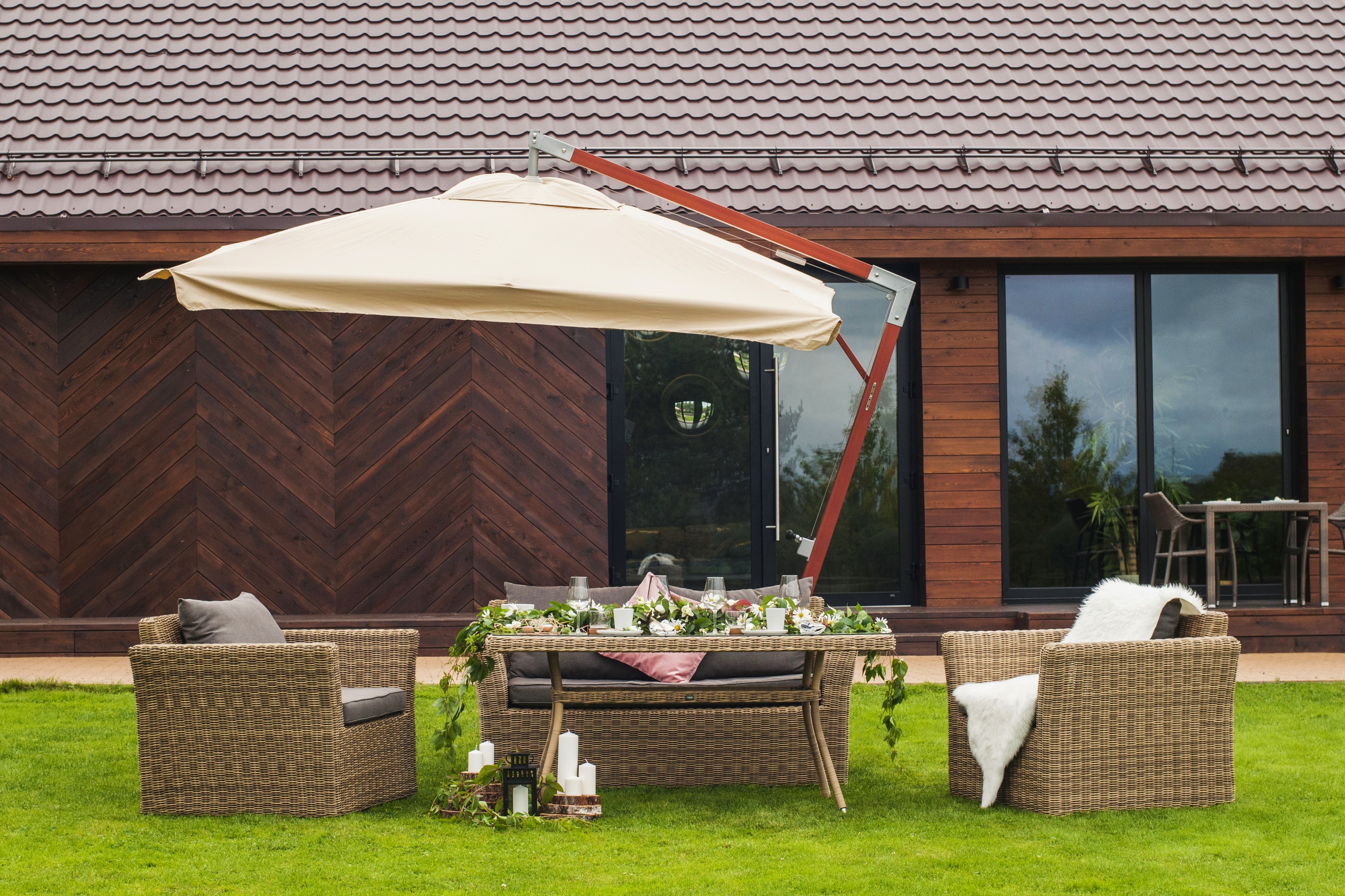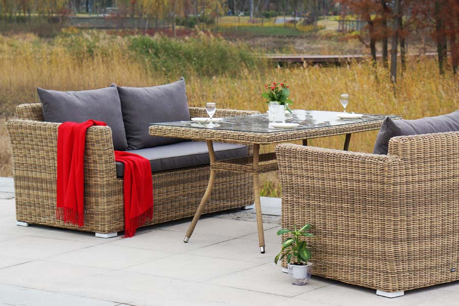 Мебель изготовлена из легкого, но прочного алюминия, оплетенного долговечным искусственным ротангом природного соломенного оттенка. На диване и креслах предусмотрены подушки с чехлами из полиэстера серо-коричневого цвета. Съёмные чехлы пропитаны специальными влагоотталкивающими средствами, которые способы защитить от намокания.