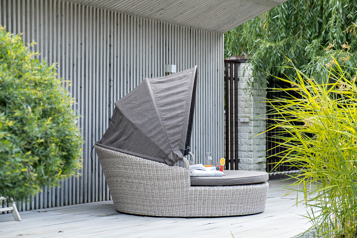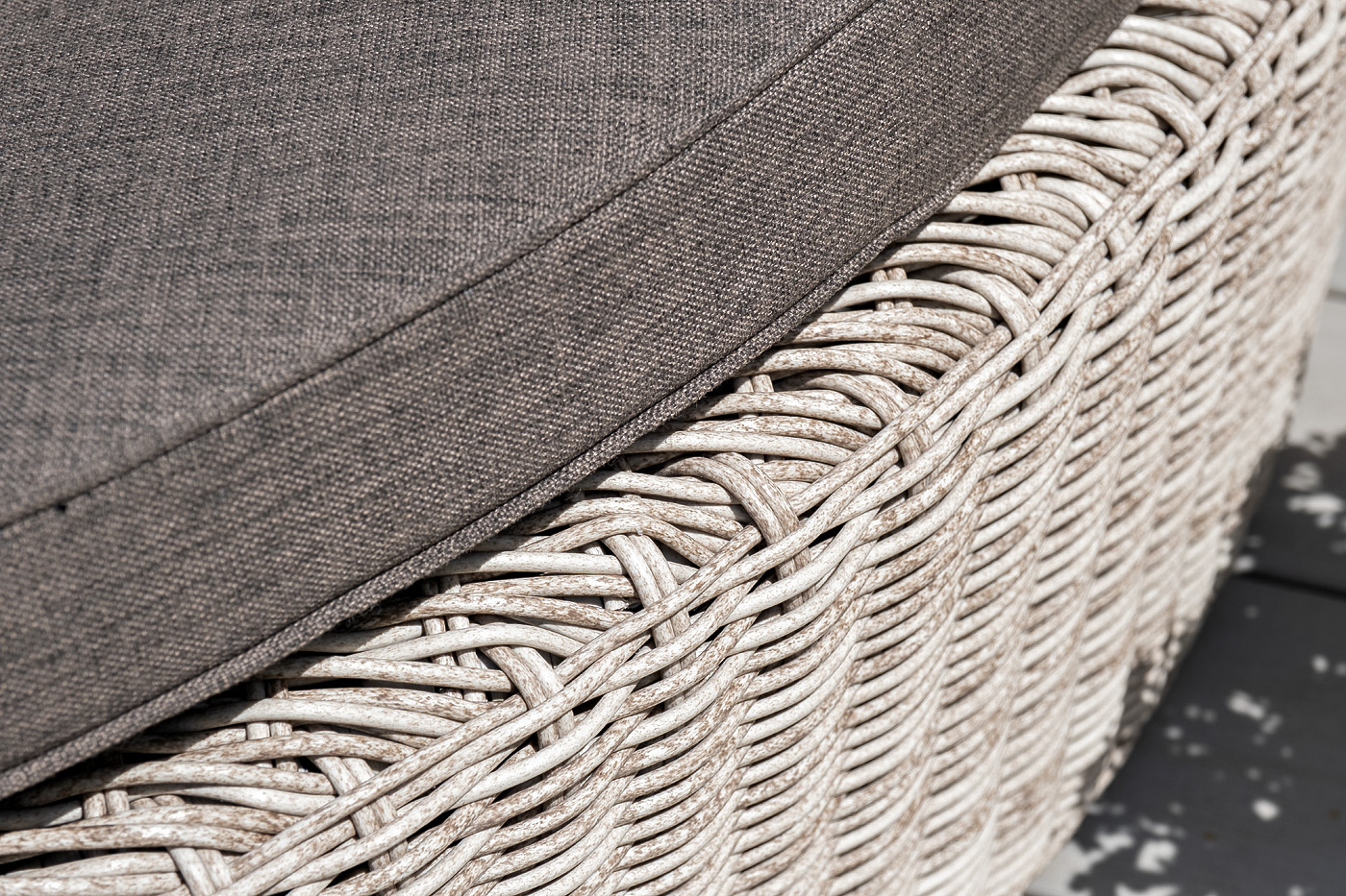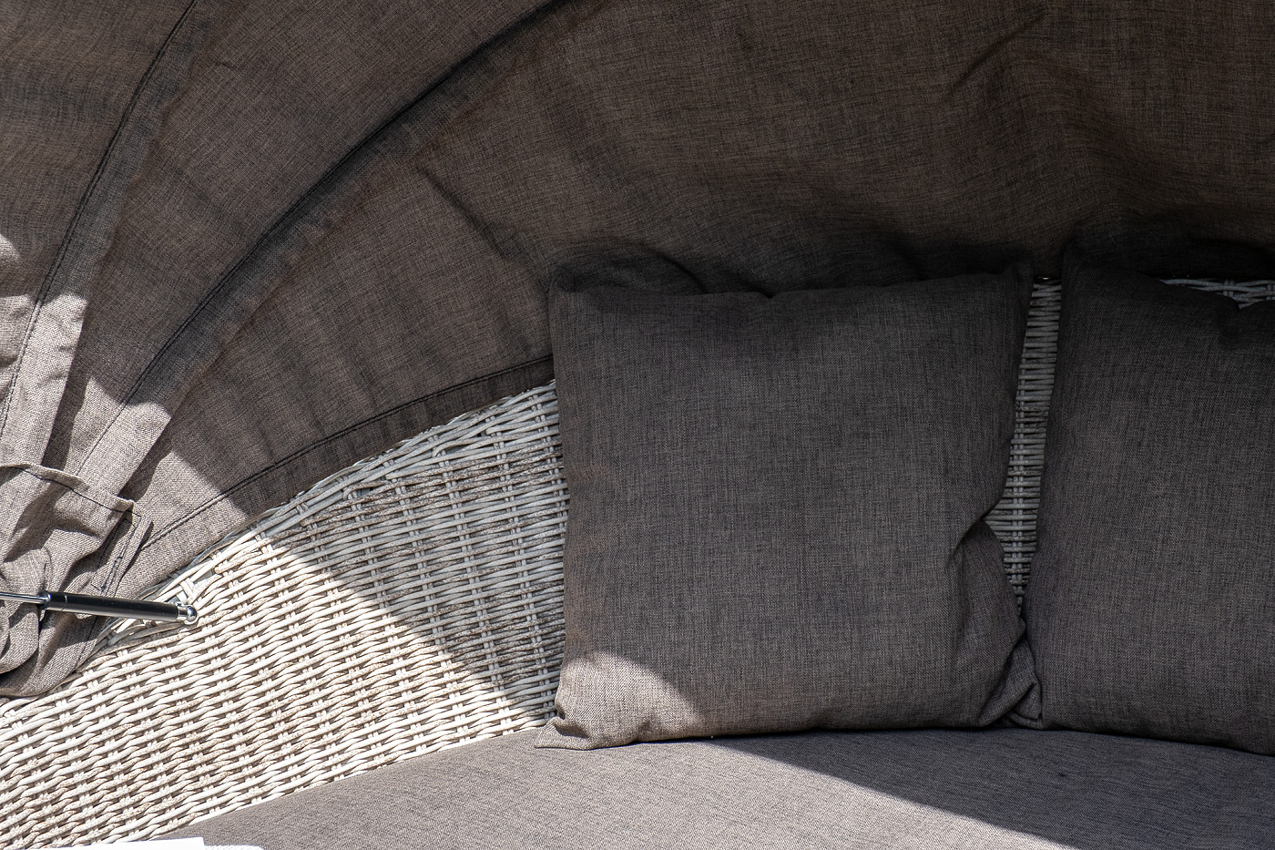Данная модель имеет в основании прочный алюминиевый каркас, оплетенный вручную круглым ротангом светло-серого цвета и оснащена регулируемым козырьком, который ограничивает попадание солнечных лучей. Выполнен из водостойкой полиэфирной ткани.