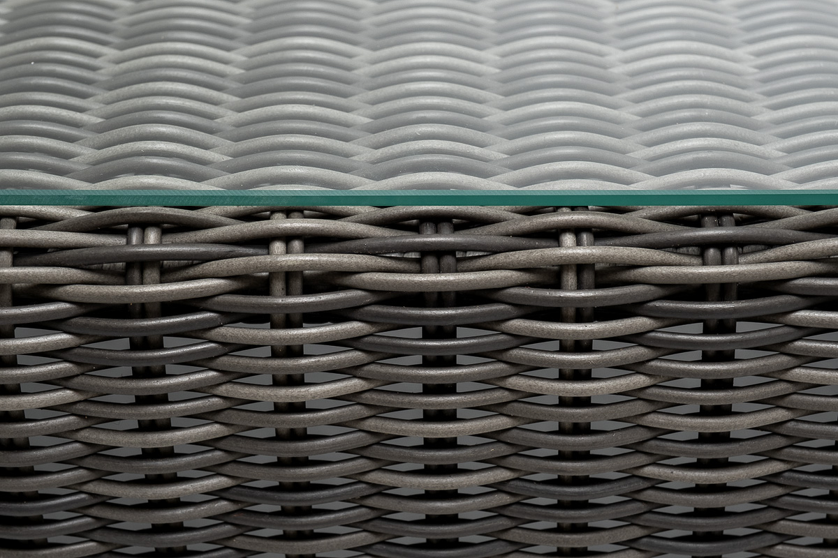 Каркас столика изготовлен из алюминия, вручную оплетенного круглым искусственным ротангом.